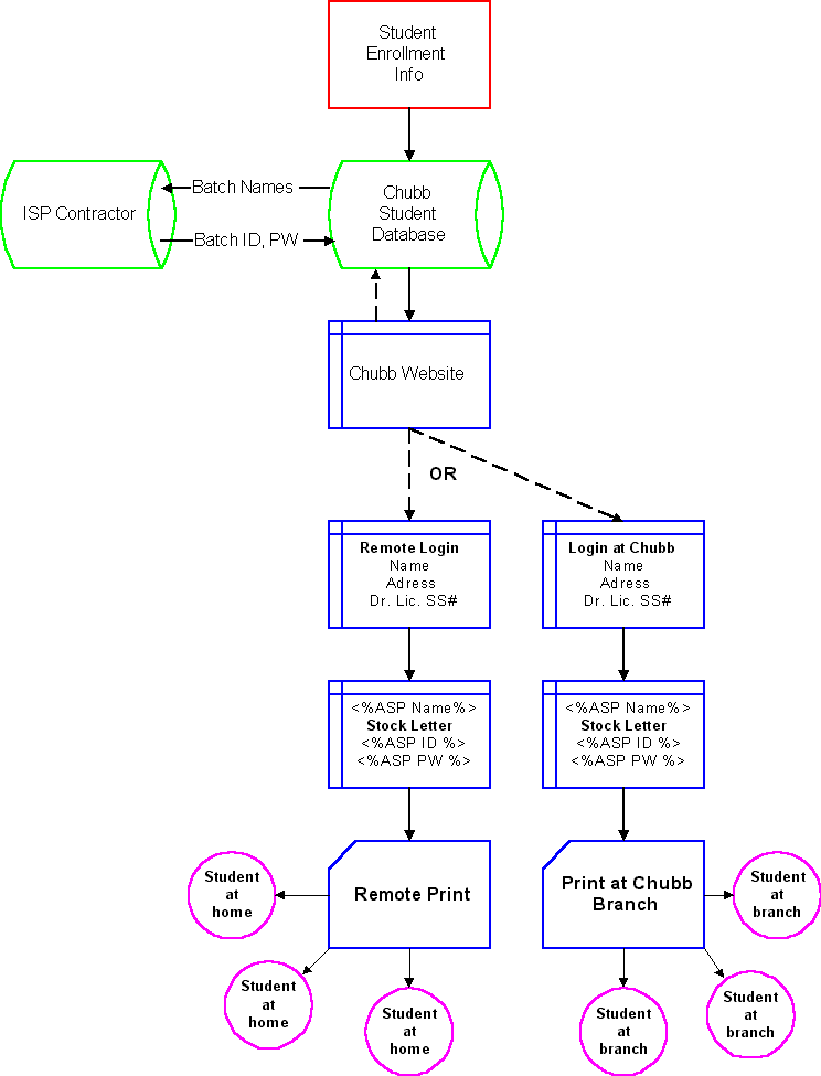 The idea behind this proposal is to save money & time, and add convenience. To do this, Chubb would simply have the IDs & Passwords sent directly to the Student Information Database from the ISP contractor. The DBAs could add two new columns to the database to receive this information. Then, an active web page would be constructed containing all of the stock orientation copy found in the form letter. This page would contain three dynamic fields: Student Name, Student ID, and Student Password. Each student could query the Database either from home or from a Chubb branch, obtaining information using both low-security keys like Name and Address and high-security keys like Driver's License # and Social Security #. The advantages of this system would be mainly savings in printing, postage, and fulfillment center labor costs. Additional savings could also come from remote users printing on their own equipment. Another benefit of this system could be convenience for the users. The numbers involved should speak for themselves. The difference in cost between the current method and the proposed method for 1000 students, twice a year, could easily amount to savings in the tens of thousands of dollars, especially in the long run. |